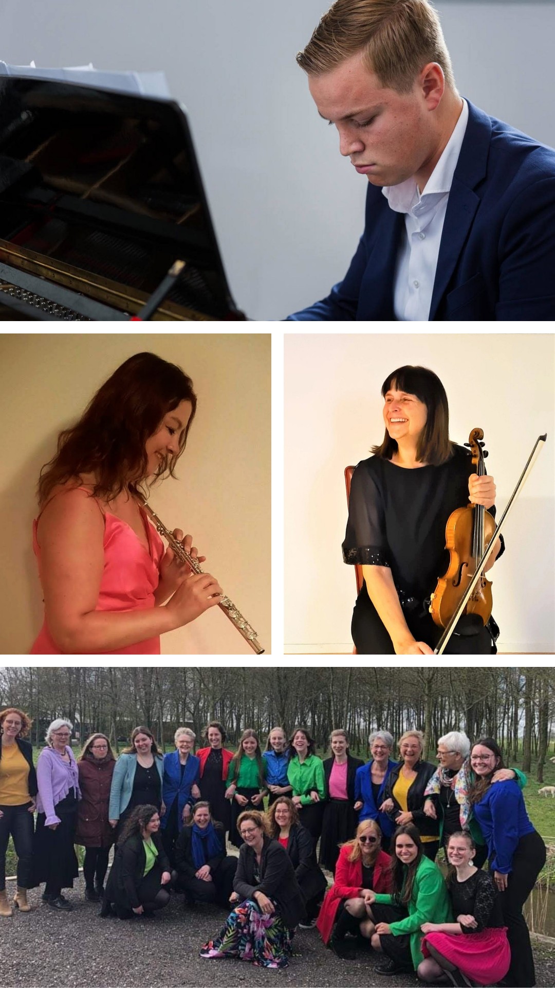 Tijdens dit concert wordt het koor ondersteund door Sannie de Jongh op fluit, Esther Papma op viool en Laurence Fierens op piano. Sannie de Jongh heeft fluit gestudeerd aan het Conservatorium van Amsterdam bij Marieke Schneemann. Esther Papma studeerde viool aan het Conservatorium van Rotterdam. Laurence Fierens studeert piano bij Andrew Wright.